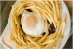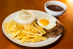 Bife de entrecot, ovo, arroz, feijão e batata frita.