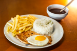 Bife de frango, ovo, arroz, feijão e batata frita.