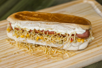 Pão de dog , maoinese planetário, milho, ervilha, tomate,molho de tomate, frango desfiado e batata palha.