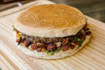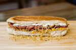 Pão de xis, maoinese planetário, milho, ervilha, tomate, alface, bacon, calabresa e coração fatiado, queijo e ovo.