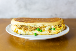 Duas fatias pão de forma, margarina,presunto, queijo e ovo.
