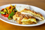 Bife de entrecot empanado, presunto, queijo, molho de tomate e arroz.Você escolhe o acompanhamento. Acompanhamentos: Batata Frita, Salada ou Vegetais.