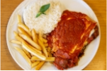 Bife de frango empanado, presunto, queijo, molho de tomate e arroz.Você escolhe o acompanhamento. Acompanhamentos: Batata Frita, Salada ou Vegetais.