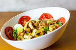 Frango grelhado em iscas, ovo, alface, tomate, croutons, molho de iogurte e parmesão ralado.